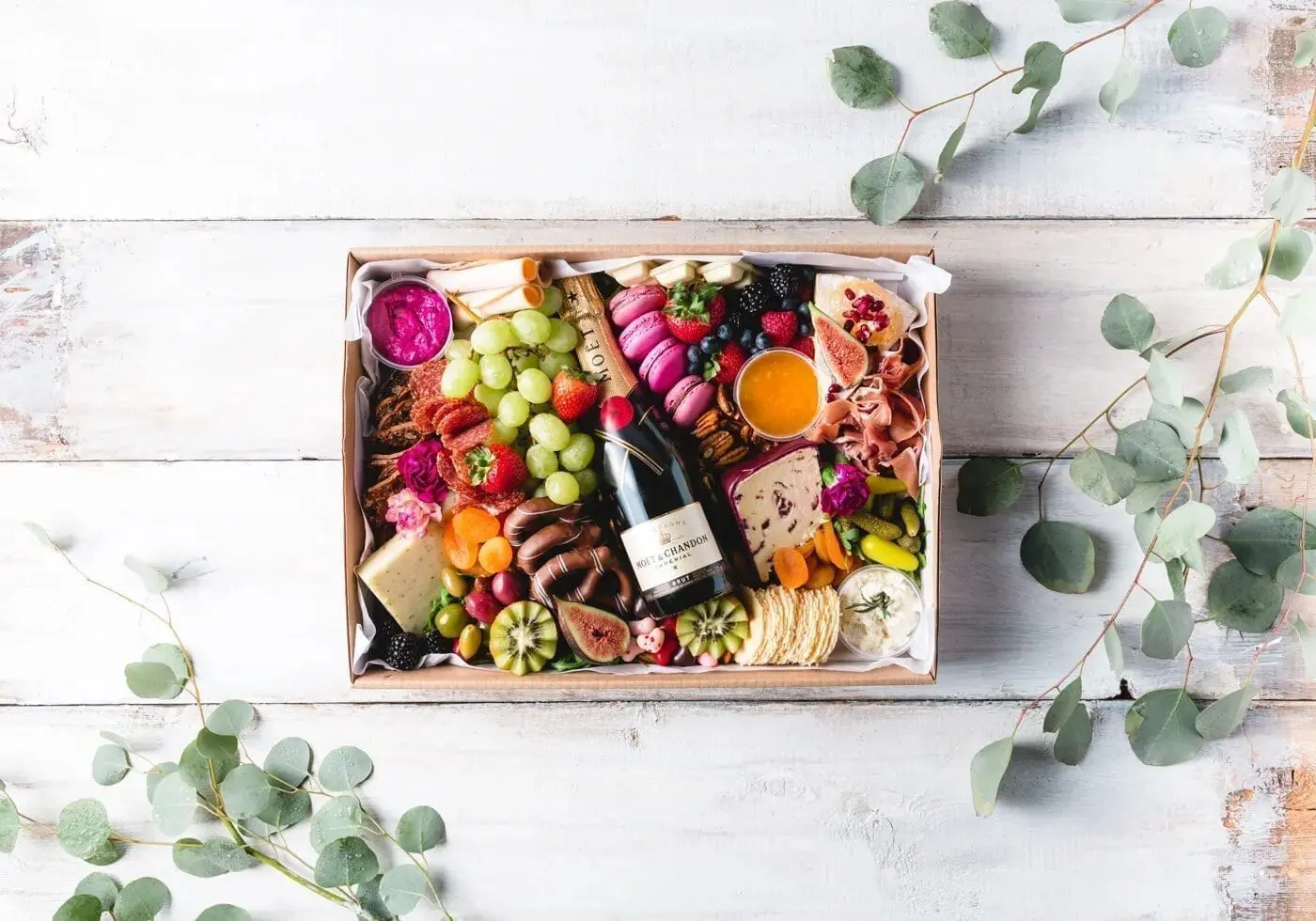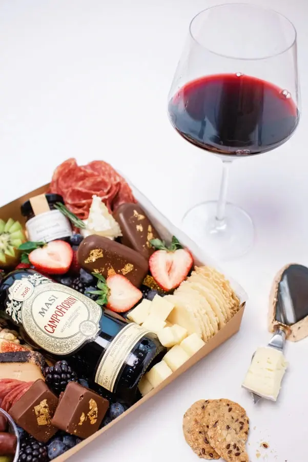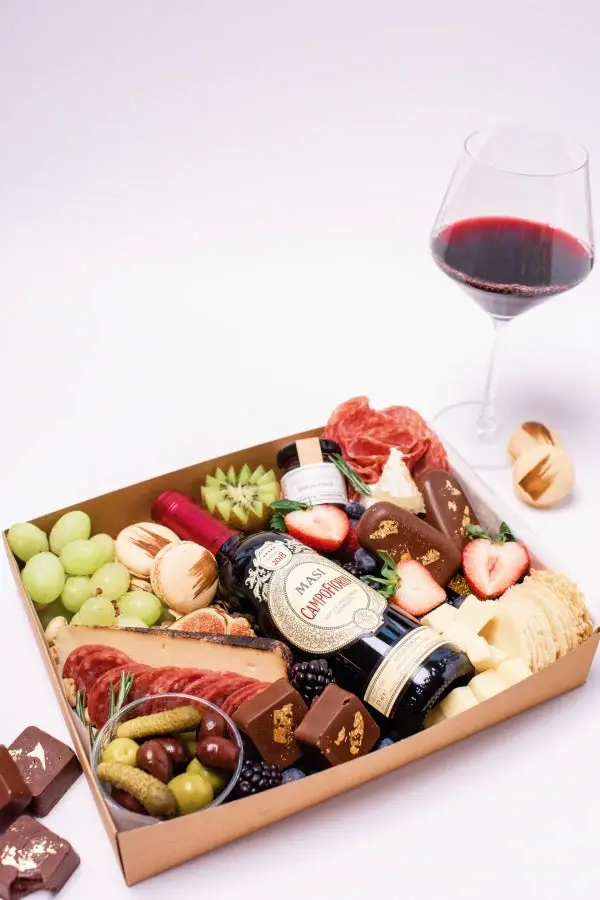 Each Small Gentleman’s Graze Box comes with a 375ml bottle of Masi Campofiorin, 2 charcuteries, 3 cheeses, 2 handcrafted macarons, 2 handcrafted chocolate gold foiled truffles, 2 handcrafted gold foiled cake pops, crackers, a jar of artisan preserve, fresh fruit, olives and cornichons, and nuts.