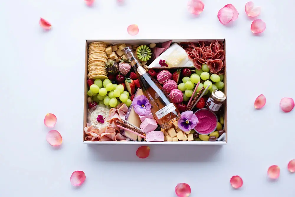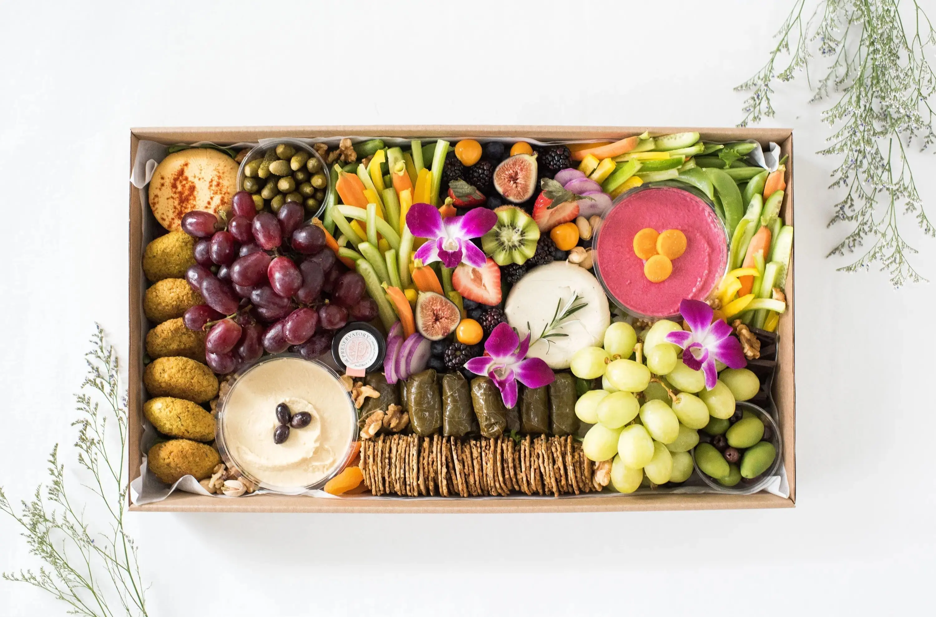 Each Mini box comes with 6 crackers, a selection of charcuteries, cheeses, fresh fruit, dried fruit, olives & cornichons, nuts (walnuts and pistachios), and floral.