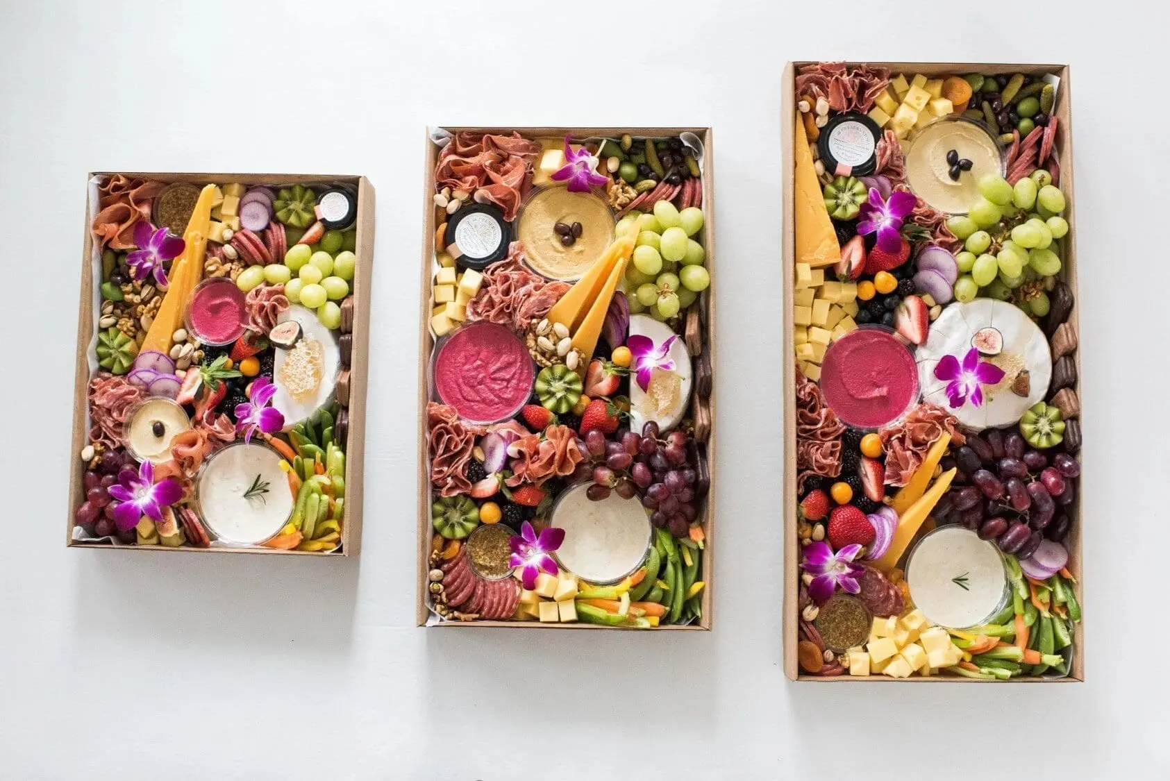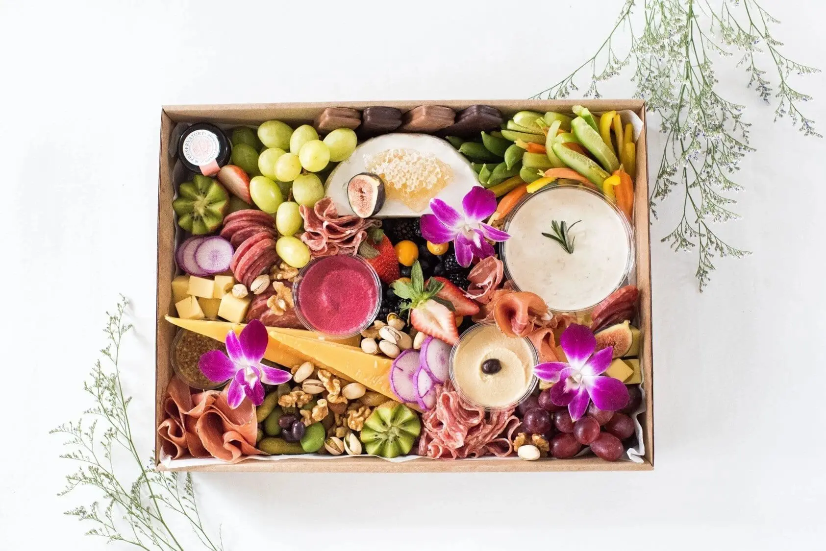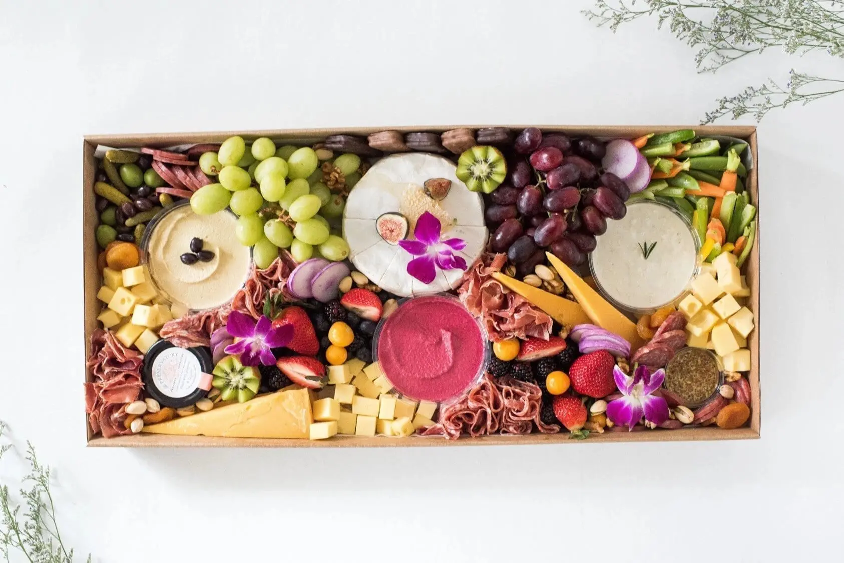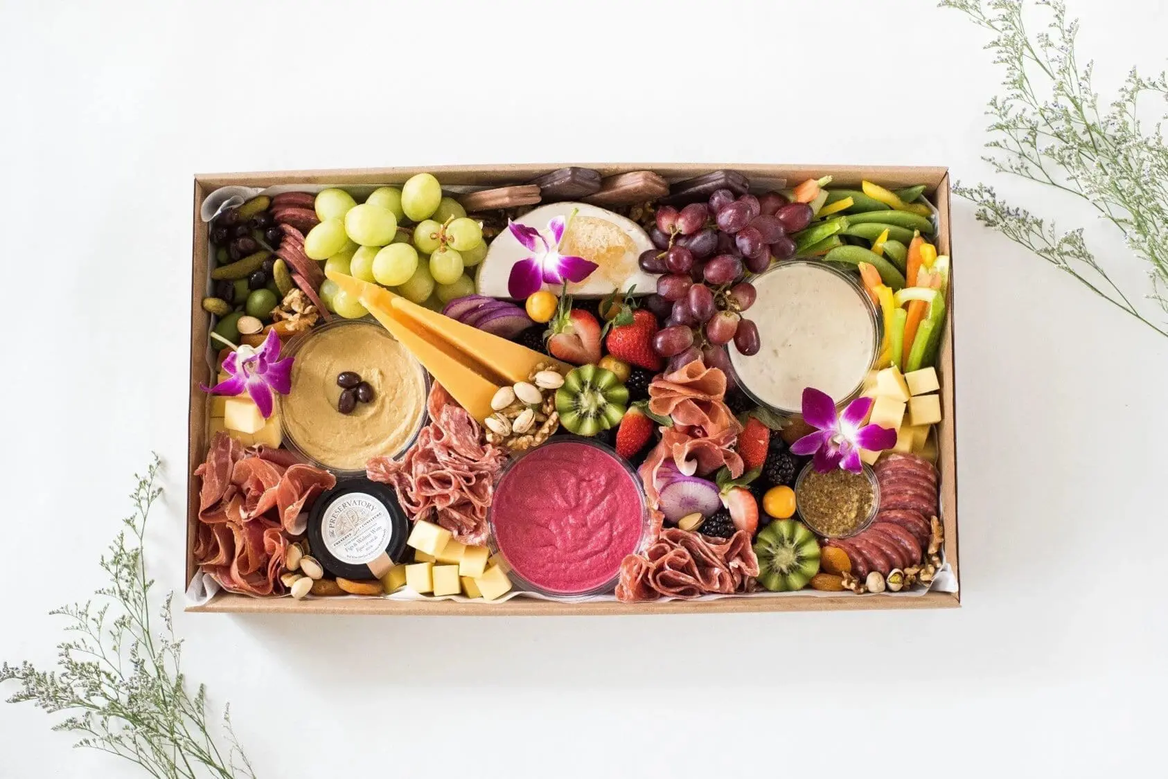 Each box comes with a selection of charcuteries, cheeses, wholesome dips, an artisan preserve, crudités, fresh fruit, dried fruit, olives & cornichons, nuts (walnuts and pistachios), chocolate, and floral.